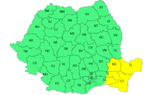 În intervalul menționat, în Dobrogea și în estul Munteniei vântul va avea intensificări cu viteze la rafală în general de 50…60 km/h.